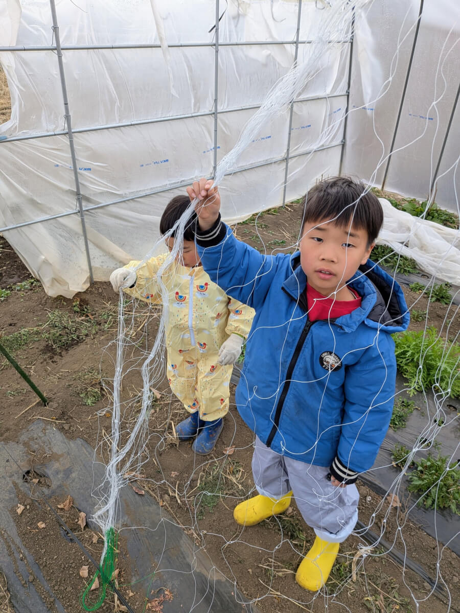 なんでネットを張ってるかというと、スナップえんどうは上にどんどん伸びていくので、ネットに這わせて収穫をしやすいようにしています。